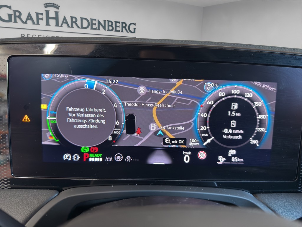 Stromverbrauch bei rein elektrischem Antrieb: 15,2 kWh/100km (Innenstadt), 14,1 kWh/100km (Stadtrand), 14,7 kWh/100km (Landstraße), 23,7 kWh/100km (Autobahn), 17,3 kWh/100km (komb.)